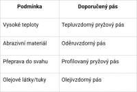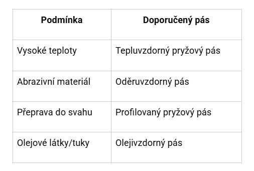 U materiálů obsahujících tuky nebo oleje je vhodné zvolit pásy odolné proti oleji. Na abrazivní nebo sypký materiál zase použijte odolnější pryžové pásy. Tepluvzdorné pásy zvládnou i materiály do 150°C.